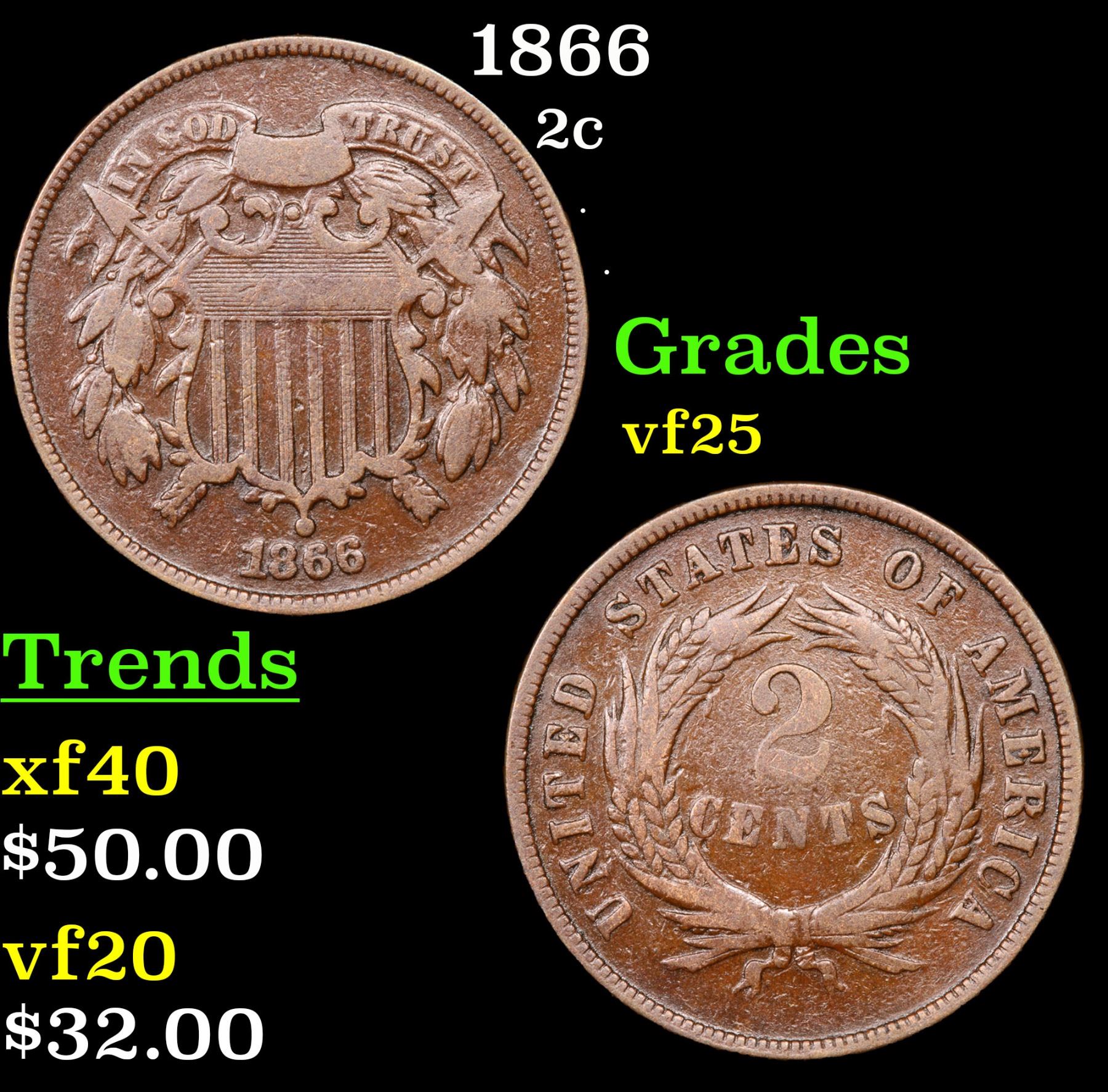1866 . . Two Cent Piece 2c Grades vf+.