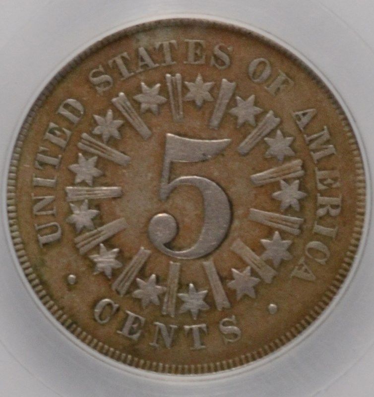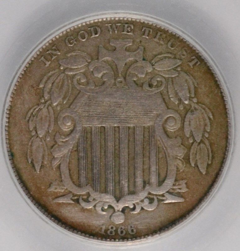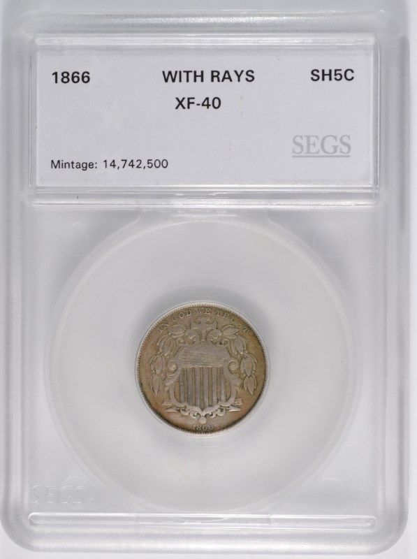 1866 WITH RAYS SHIELD NICKEL, SEGS XF-40 NICE