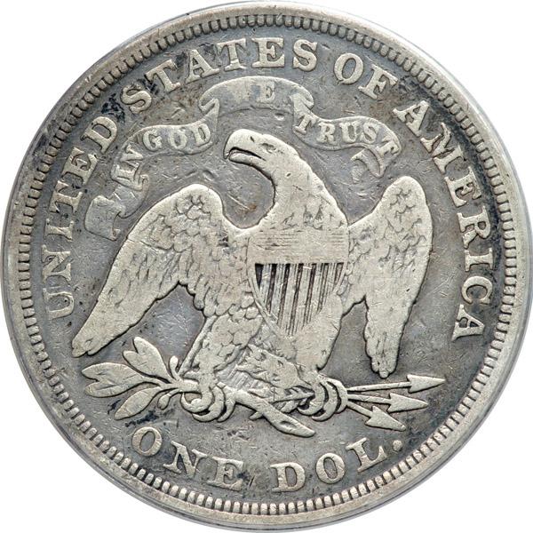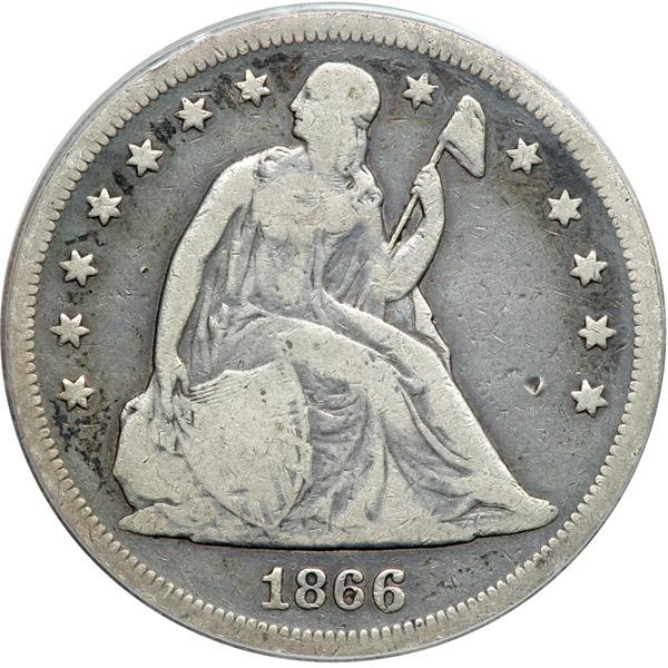 1866 With Motto PCGS graded Genuine. Our grade is VG-8 probably cleaned long ago. Evenly worn. One of the most popular issues in Seated Dollars. Only 48,900 struck (PCGS # 6959) .