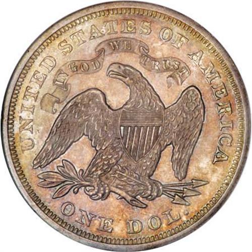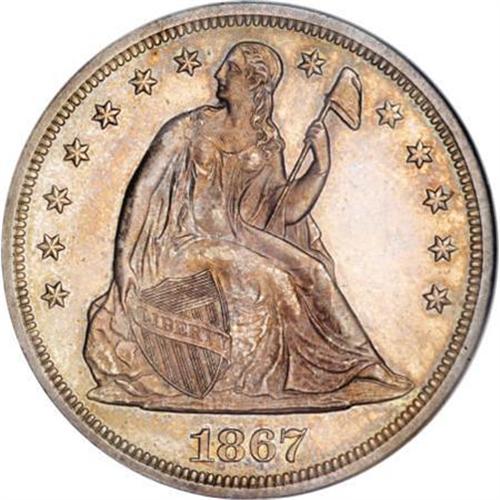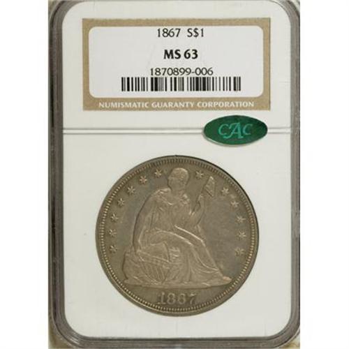 <B>1867 $1 MS63 NGC. CAC.</B></I> A blend of reddish-gold, lavender, and sky-blue patina covers the lustrous surfaces on both sides of this lovely specimen, and a well directed strike brings out excellent definition on the design elements, except for the usual softness on stars 9 and 10. There are fewer marks than what might be expected for the grade designation. Census: 7 in 63, 11 finer (2/08).<BR><I>From The Queller Family Collection of Silver Dollars.</B></I><BR><BR><B>Coin Engraver:</B> Christian Gobrecht<BR><BR><b>Shipping:</b> Coins & Currency (<a target="_blank" href="http://www.heritageauctions.com/common/shipping.php">view shipping information</a>)