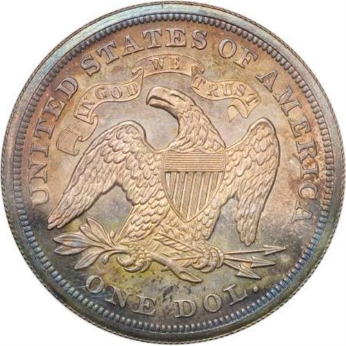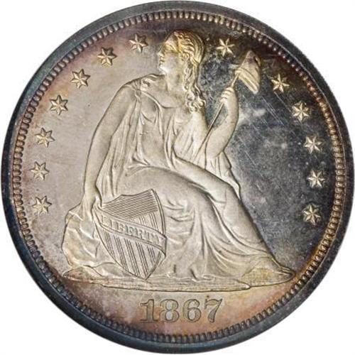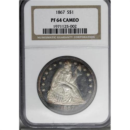 <B>1867 $1 PR64 Cameo NGC.</B></I> A magnificent example, this Choice proof piece exhibits delightful contrast between the deeply mirrored fields and brilliant, lustrous devices, subdued by dark gold on the reverse. The central obverse is essentially brilliant and both sides have attractive peripheral toning. Census: 19 in 64 Cameo, 19 finer (10/07).<BR><BR><b>Shipping:</b> Coins & Currency (<a target="_blank" href="http://www.heritageauctions.com/common/shipping.php">view shipping information</a>)