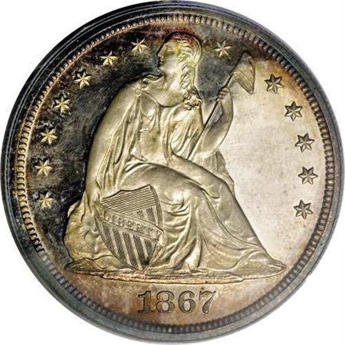 <B>1867 $1 PR64 Cameo PCGS.</B></I> The obverse has a silver center shaded at the peripheries with iridescent amber and blue; the reverse has those same colors of deeper intensity, covering that side. Lustrous, with deeply mirrored fields and frosty devices. A lovely and elusive example of this early proof issue. Population: 13 in 64, 4 finer (1/08).<BR><BR><b>Shipping:</b> Coins & Currency (<a target="_blank" href="http://www.heritageauctions.com/common/shipping.php">view shipping information</a>)
