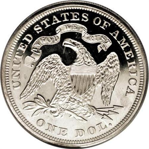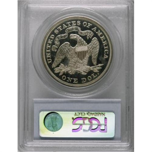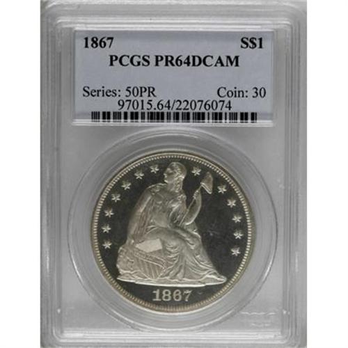 <B>1867 $1 PR64 Deep Cameo PCGS.</B></I> A total of 625 Seated Liberty dollars were struck in proof format in 1867. PCGS and NGC have seen nearly 400 examples. The services assigned the Cameo label to approximately 70 examples, and Deep Cameo to just 16 specimens.<BR> The essentially untoned surfaces of the near-Gem Deep Cameo presented in this lot exhibit strong contrast between heavily frosted design elements and deep mirror fields. A well executed strike prevails throughout, rendering the field-motif contrast even more outstanding. Magnification reveals some fine hairlines in the fields that help to prevent a higher grade. Population: 3 in 64 Deep Cameo, 1 finer (6/07).<BR><BR><b>Shipping:</b> Coins & Currency (<a target="_blank" href="http://www.heritageauctions.com/common/shipping.php">view shipping information</a>\)