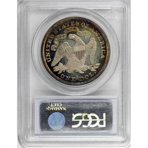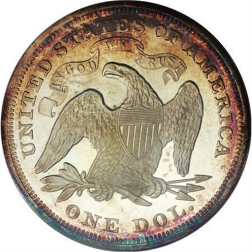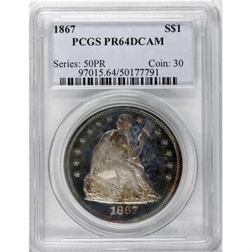 <B>1867 $1 PR64 Deep Cameo PCGS.</B></I> Rich citrine, amber, and sapphire shadings adorn the margins, while the centers display more delicate champagne and cloud-gray patina. Both sides offer excellent contrast that is uninhibited by the toning, and the overall level of detail is bold. Though faint hairlines and a few tiny contact marks in the fields preclude Gem status, the coin's immense visual appeal is undeniable.<BR> The proof silver dollars of 1867, originally numbering 625 specimens, comprise the second With Motto proof issue for the denomination. Though the PCGS <I>Population Report</B></I> shows a number of survivors, surprisingly few display a significant cameo effect, with just eight pieces awarded a Deep Cameo designation. Of those coins, this example is tied with four others, with just one finer (11/07).<BR><BR><b>Shipping:</b> Coins & Currency (<a target="_blank" href="http://www.heritageauctions.com/common/shipping.php">view shipping information</a>)