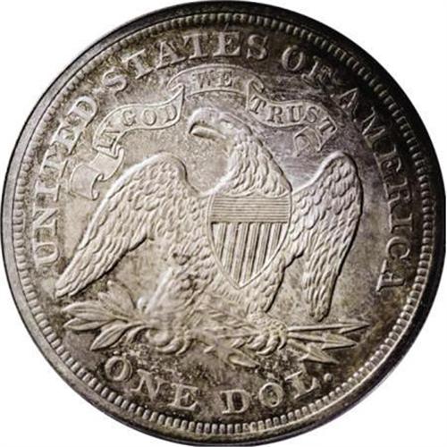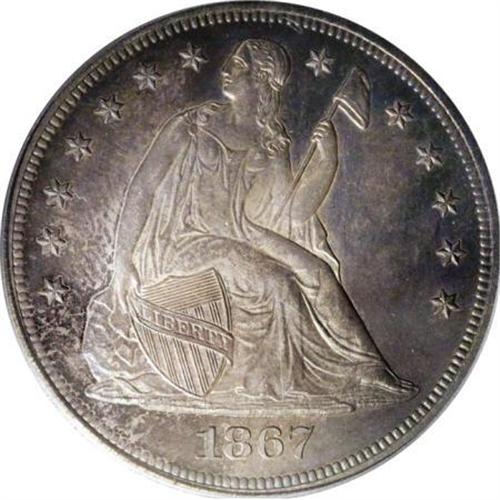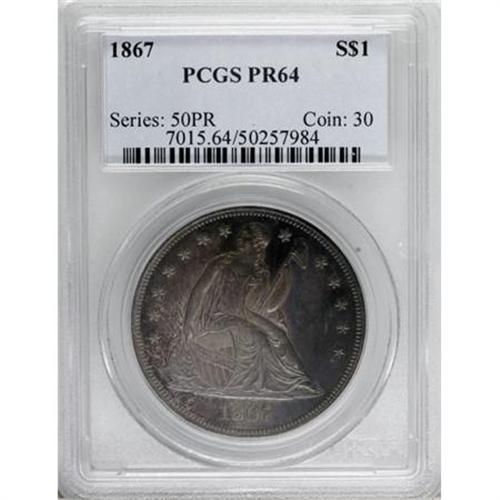 <B>1867 $1 PR64 PCGS.</B></I> Electric-blue, apricot, rose, and plum-mauve patina envelops this intricately struck Choice Motto proof. The holder is a bit scuffy, but the coin itself has pleasing preservation. A mere 625 proofs were struck, and most of the 46,900 business strikes were exported and eventually melted. Population: 67 in 64, 18 finer (5/07).<BR><BR><b>Shipping:</b> Coins & Currency (<a target="_blank" href="http://www.heritageauctions.com/common/shipping.php">view shipping information</a>)