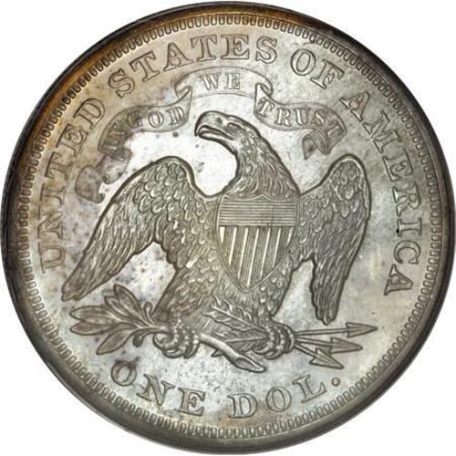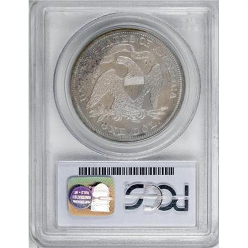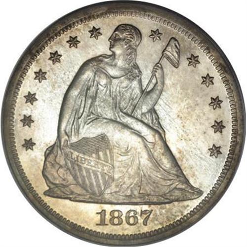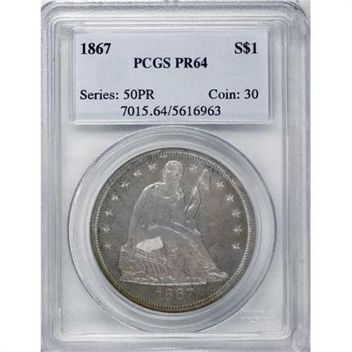 <B>1867 $1 PR64 PCGS.</B></I> Light beige-gold and ice-blue color resides on both sides of this near-Gem proof. A well executed strike emboldens the mildly frosted design elements, that offer a measure of contrast with the mirrored fields. Seemingly devoid of mentionable abrasions. Population: 67 in 64, 17 finer (12/07).<BR><BR><B>Coin Engraver:</B> Christian Gobrecht<BR><BR><b>Shipping:</b> Coins & Currency (<a target="_blank" href="http://www.heritageauctions.com/common/shipping.php">view shipping information</a>)