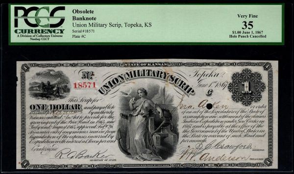 One 1867 $1 Union Military Scrip Topeka Kansas PCGS 35.