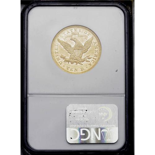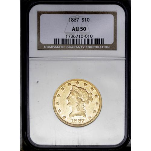 <B>1867<$10> AU50 NGC.</B></I> As with all P-mint eagles from this era, the bulk of gold production in 1867 was awarded to the double eagle denomination. Consequently, a scant 3,090 ten dollar pieces were minted for commercial use. Both sides of this still-lustrous example are normally abraded, the most bothersome of which is a thin scrape in front of Liberty's nose. Attractive reddish patina covers both sides. Census: 8 in 50, 29 finer (3/06).<BR><I>From The Steve Glenn Collection.</B></I> <BR><BR><B>Important notice:</B> Heritage usually auctions material at the rate of 200-250 lots per hour. On some occasions eBay Live bid software or the Internet may not be able to keep up with the pace of the auction. We recommend placing a realistic absentee bid now as insurance to avoid disappointment. Occasionally the auctioneer may eliminate or reject an eBay Live bid, and the auctioneer may also reopen a lot after the close of the eBay live bidding (usually because we missed an audience bid), and may reject your bid even if it shows you as the winning bidder. By bidding via eBay Live, you agree that Heritage may award the lot to another bidder at its sole discretion under the circumstances described above or any other reasonable circumstances. Since eBay bids are not shown to us until we open the lot on the floor, we treat those bids just like floor bids. In most cases the floor responds before the eBay bid is presented to us, due to Internet lag time, so for consistency we have made it a policy that floor bids are always considered first over tie eBay live bids. Also please note that all Heritage lots purchased through eBay Live carry a 20% Buyer's Premium. Please make sure you read the Terms and Conditions before you bid. This lot is being auctioned in conjunction with a live floor auction by Heritage Galleries & Auctioneers. All final auction and invoice information will be supplied by Heritage Galleries & Auctioneers, and all other information should be considered preliminary. Lot:3965 <BR><BR><B>Winning Notification and Billing:</B> After the FINAL session in this auction is complete, Heritage will send e-mail and snail mail invoices. This process normally takes several days. All final auction and invoice information will be supplied by Heritage Galleries & Auctioneers, and all other information should be considered preliminary. <BR><BR>This auction will be conducted on a live auction floor and over the Internet through eBay Live. If you choose to place an absentee bid, please take a moment to <font color='#0000ff'><u><a href='http://pages.ebay.com/liveauctions/help/before/laabsentee.html'>learn how eBay Live absentee bidding works</a></u></font><font color='#000000'>