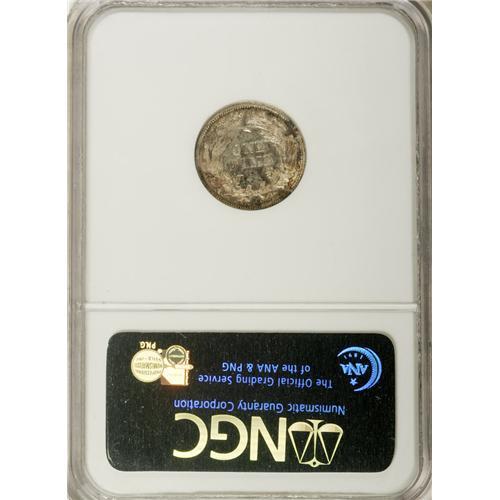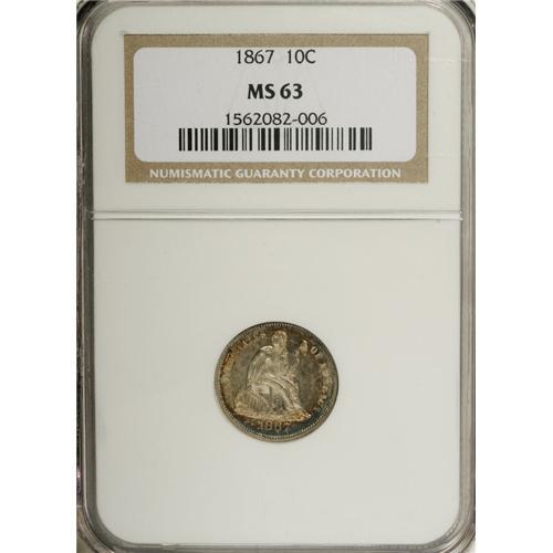 <B>1867 10C MS63 NGC.</B></I> Well struck with semi-prooflike fields and lovely reddish-brown and electric-blue toning on each side. Moderate die clash marks are noticeable on the obverse. A small number of blemishes prevent a higher grade; of which a notable mark resides just below O in ONE. Census: 3 in 63, 32 finer (4/07).<BR><I>From The Southland Collection.</B></I><BR><BR><b>Shipping:</b> Coins & Currency (<a target="_blank" href="http://www.heritageauctions.com/common/shipping.php">view shipping information</a>)