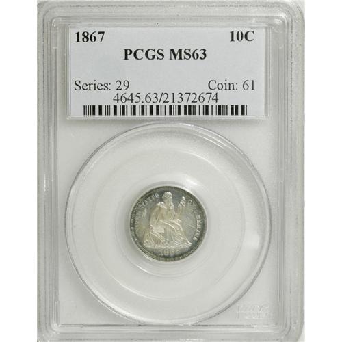 <B>1867 10C MS63 PCGS.</B></I> Crisply struck and nicely preserved, this Select example displays semi-reflective fields and well frosted devices. Die striations in the fields contribute to the noteworthy semi-prooflikeness of the piece. Well struck with clash marks noted on the obverse, and minimal surface disturbances for the grade.<BR><BR><b>Shipping:</b> Coins & Currency (<a target="_blank" href="http://www.heritageauctions.com/common/shipping.php">view shipping information</a>)