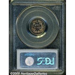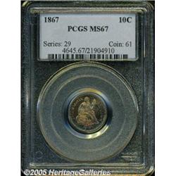 <B>1867 10C MS67 PCGS.</B></I> Variety 103. The 1867 is a well-known rarity among Seated dime collectors. Below XF it is even scarcer than the 1874-CC, and it is always under intense collector demand as it has the lowest mintage of any regular issue Seated dime. This particular variety is rare and die clashing is always seen on high grade specimens, and so it is with this piece. Greer notes, "I have not seen proofs from this obverse die." The inference we make from this statement is that this obverse die was heavily polished and coins from this die might resemble proofs. This piece is certainly deceptive at first glance. The fields are deeply reflective and the striking details are fully brought up in all areas. However, the aforementioned die clash marks are present and this simply does not square with a proof coin. Rich, variegated russet-rose toning covers both sides with occasional splashes of blue around the margins. A rare opportunity for the specialized collector. Population: 1 in 67, 0 finer (2/05).