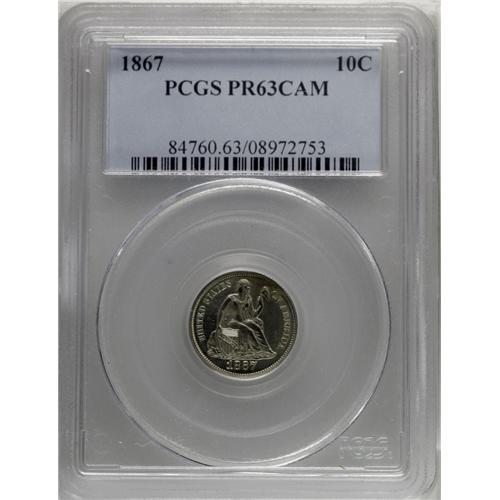 <B>1867<10C> PR63 Cameo PCGS.</B></I> Icy devices compare with suitably mirrored fields. A well struck and untoned example that is lovely for the designated grade. The date is nicely repunched. A mere proofs were struck.