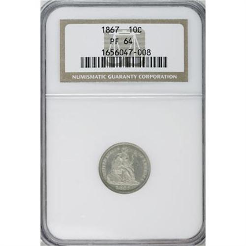 <B>1867 10C PR64 NGC.</B></I> This is a fully struck piece with none of the softness that is sometimes observed on Liberty's hair. A faint coating of milkiness with slight undertones of rose is noted over the obverse. The fields exhibit nice reflectivity and there are no troublesome contact marks on either side. Census: 36 in 64, 23 finer (3/08). <BR><BR><B>Coin Engraver:</B> Christian Gobrecht<BR><BR><b>Shipping:</b> Coins & Currency (<a target="_blank" href="http://www.heritageauctions.com/common/shipping.php">view shipping information</a>)