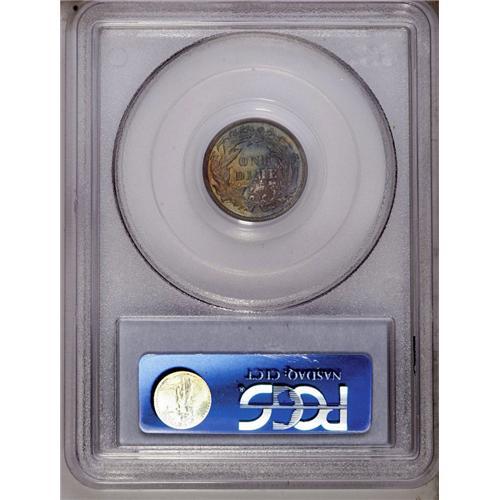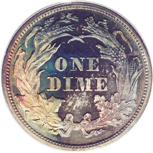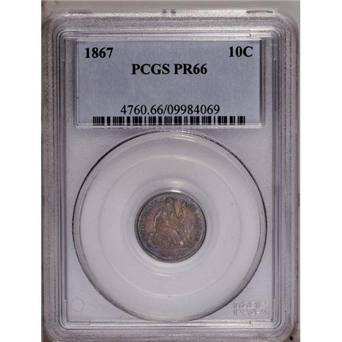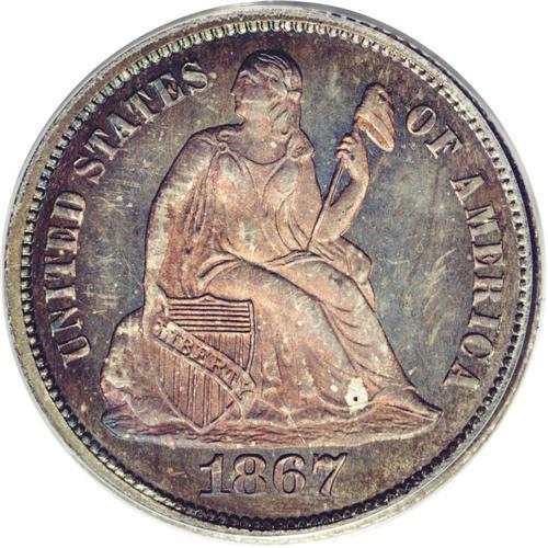 <B>1867<10C> PR66 PCGS.</B></I> Fortin-103. The 18 in the date is lightly repunched. Lavishly patinated in orange, lemon, apple-green, and plum. Despite the rich colors, the fields exhibit pleasing reflectivity. Minor incompleteness of strike on an upper left portion of the wreath is customary for the type. A mere 625 proofs were struck.