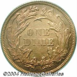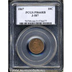 <B>1867<10C> Ten Cents, Judd-587, Pollock-652, Low R.7, PR66 Red and Brown PCGS.</B></I> Regular die trials striking of the Seated Liberty Dime for 1867. Struck in copper with a reeded edge. A sharply struck and unabraded premium Gem with radiant orange-red color and a few distributed carbon flecks on the obverse. The single finest graded among three examples of Judd-587 certified by PCGS. <BR><BR><B>Important notice:</B> Heritage usually auctions material at the rate of 200-250 lots per hour. On some occasions eBay Live bid software or the Internet may not be able to keep up with the pace of the auction. We recommend placing a realistic absentee bid now as insurance to avoid disappointment. Occasionally the auctioneer may eliminate or reject an eBay Live bid, and the auctioneer may also reopen a lot after the close of the eBay live bidding (usually because we missed an audience bid), and may reject your bid even if it shows you as the winning bidder. By bidding via eBay Live, you agree that Heritage may award the lot to another bidder at its sole discretion under the circumstances described above or any other reasonable circumstances. Since eBay bids are not shown to us until we open the lot on the floor, we treat those bids just like floor bids. In most cases the floor responds before the eBay bid is presented to us, due to Internet lag time, so for consistency we have made it a policy that floor bids are always considered first over tie eBay live bids. Also please note that all Heritage lots purchased through eBay Live carry a 20% Buyer's Premium. Please make sure you read the Terms and Conditions before you bid. </span></font></tr></table></td></tr></table>
