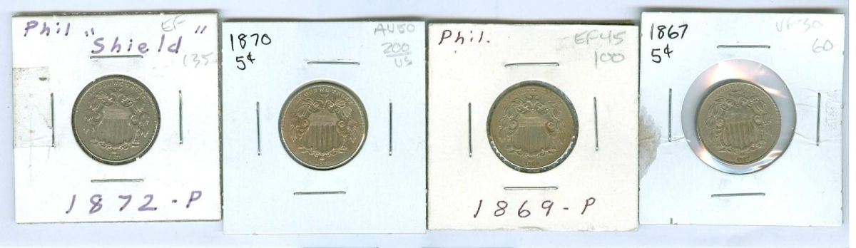 1867, 1869-P, 1870 & 1872-P 5¢. Lot of 4 coins VF to EF.