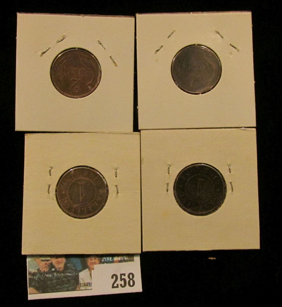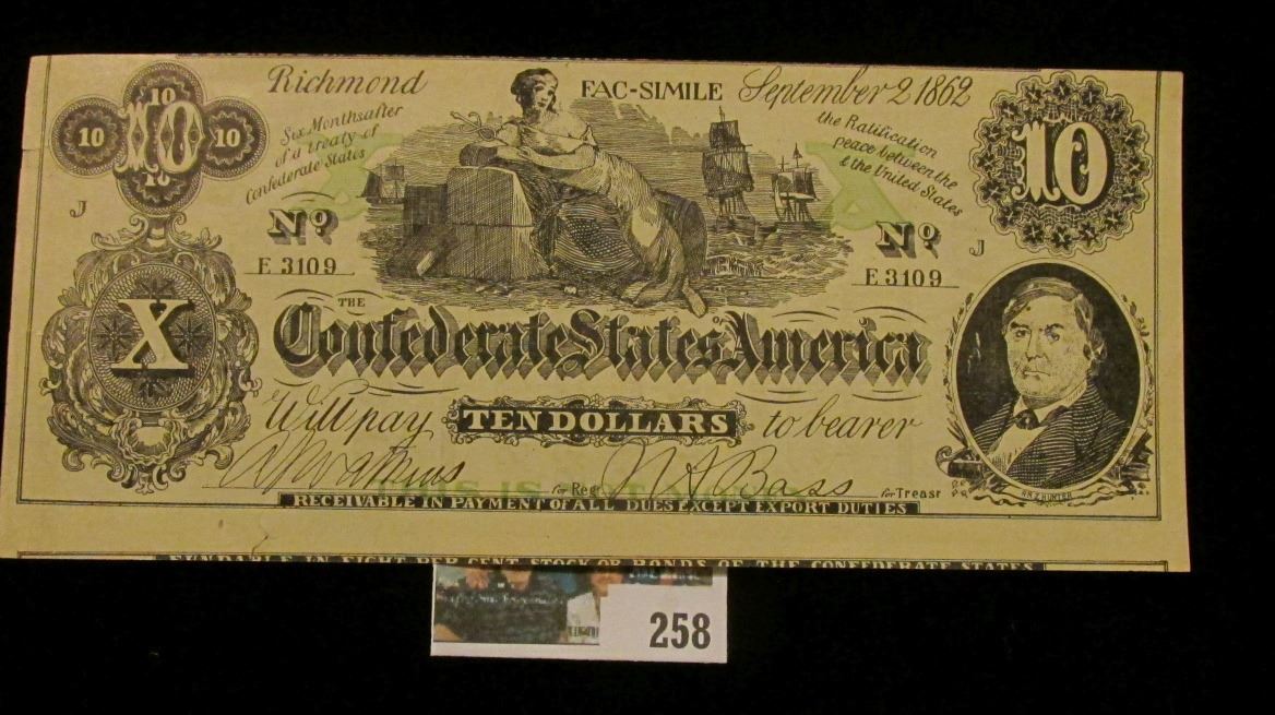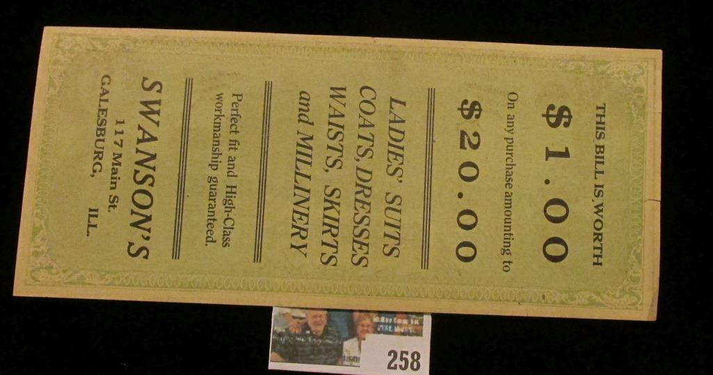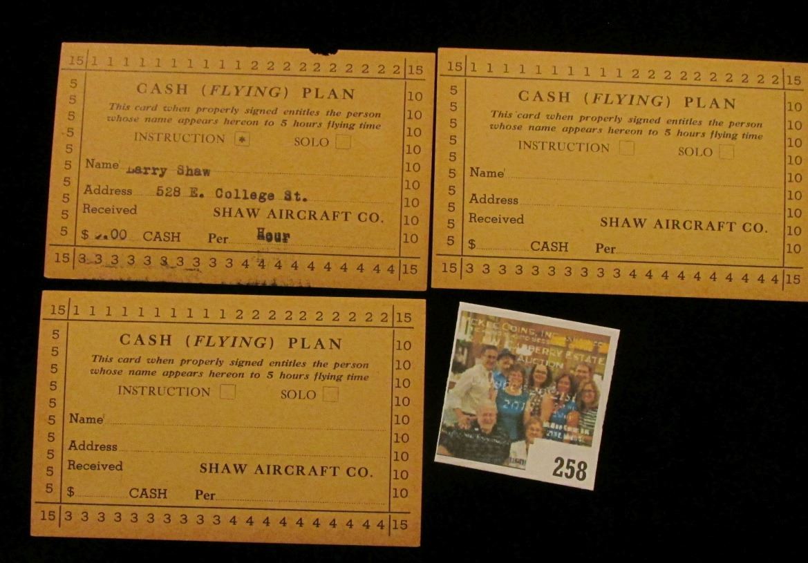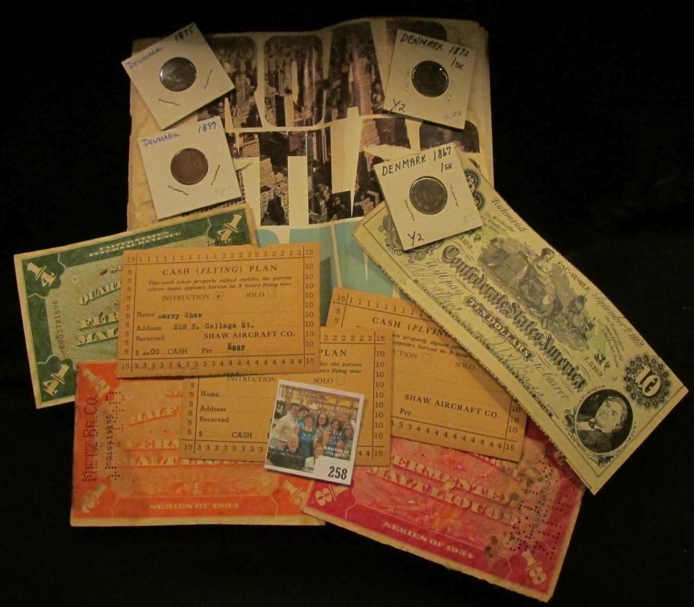 1867, 1872, 1875, & 1899 Denmark One Skilling Coins, all Fine to EF; 1967 "R& McNally" Road Atlas (used condition); (2) Different "Dane Company…Iowa City" advertising cards; pair of Iowa City "Shaw Aircraft Cash (Flying) Plan" Cards; Series 1934 Stamps for Eighth, Quarter, & Half Barrels Feremented Liquor; & a $10 Confederate States of America Advertising note from "Swanson's 117 Main St. Galesburg, Ill.".
