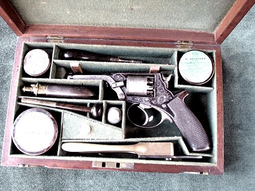1867-1885 John Rigby Percussion Revolver. Herein is a beautiful, in the original case with all original accessories, a John Rigby Percussion Revolver, Circa: 1867-1885. The quality of this set speaks for itself. The address on the top of the frame is ''Dublin''. Most of the fire blue still remains on the frame and the action is crisp and tight. John Rigby used the ''Tranter System'' of the single and double trigger operation for turning the percussion cylinder on his pistols. The case has a very interesting family crest emblem on the lid. It represents a human arm holding a dagger, alone with the initials ''JOC'' or ''LOC''. Researching the Crest would certainly be worthwhile historically. This beautiful cased John Rigby Percussion Revolver with all original accessories makes an excellent investment for the historical collector. Provenance from a respected family estate Philadelphia. Payment by Money Transfer Only.