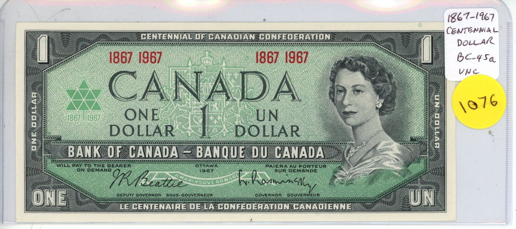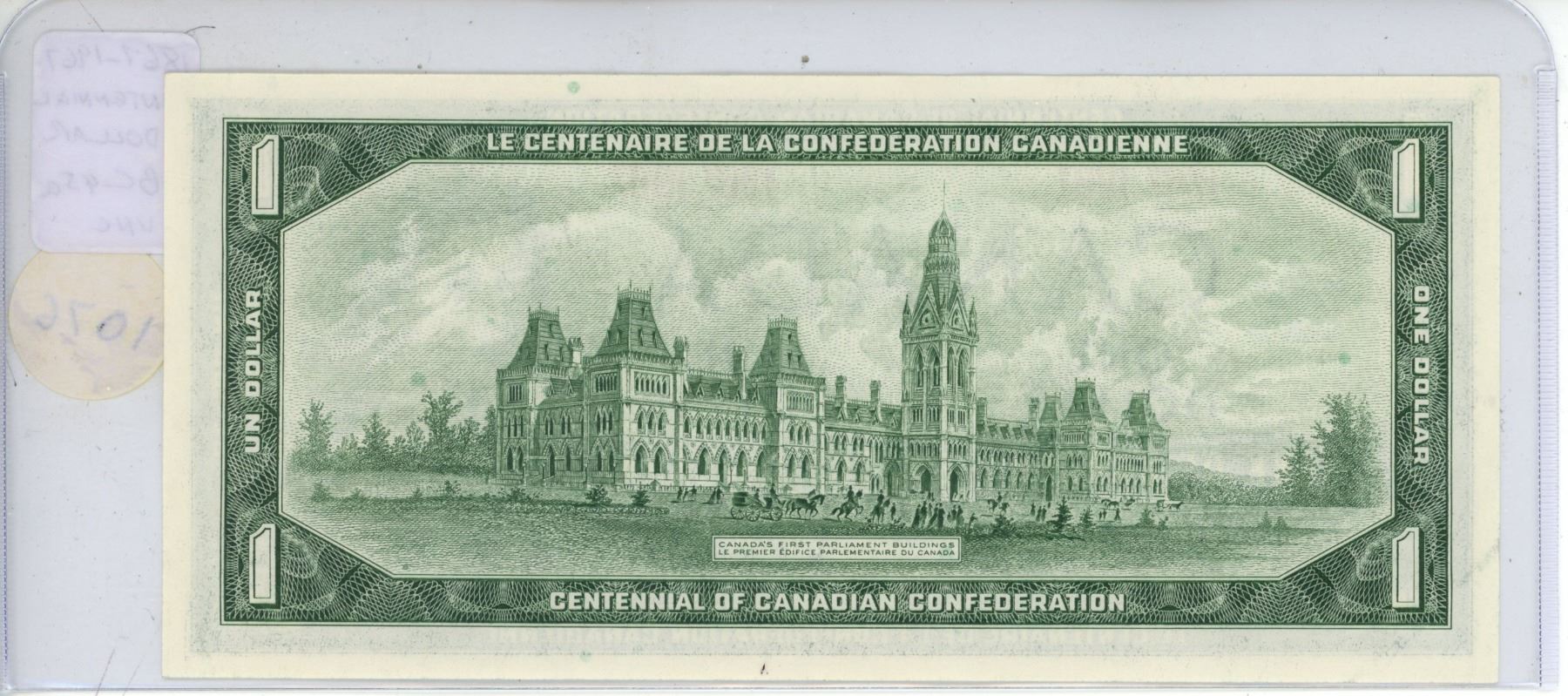 1867 – 1967 $1 Centennial note with No Serial Numbers. Beattie-Rasminsky signatures. BC-45a. Uncirculated.
