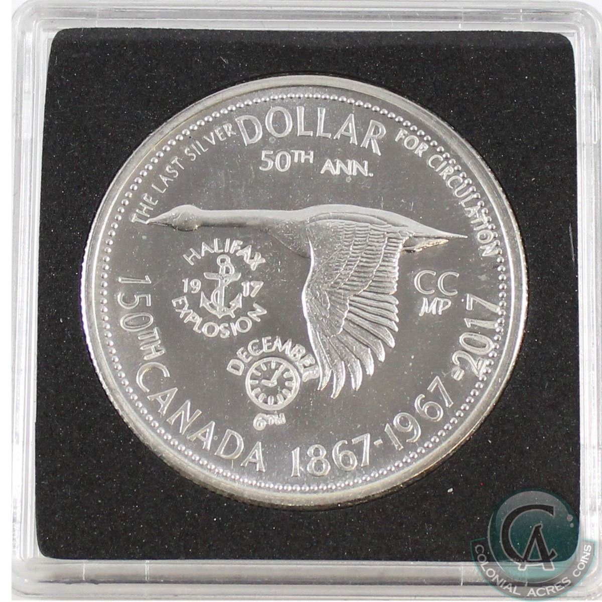 1867-1967-2017 Counter-Stamped Silver Dollar Commemorating the 150th Anniversary of Canada & 100th Anniversary of the Halifax Explosion. The Halifax Explosion was a maritime disaster in Halifax, Nova Scotia, which happened on the morning of 6 December 1917. This Counter-Stamped dollar was issued by Citadel Coins to commemorate both these historic events. Limited mintage 200.