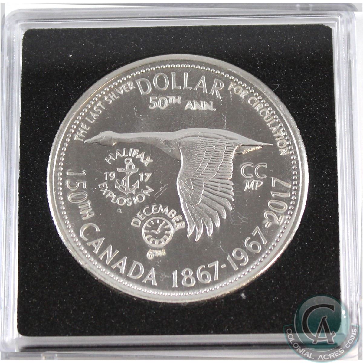 1867-1967-2017 Counter-Stamped Silver Dollar Commemorating the 150th Anniversary of Canada & 100th Anniversary of the Halifax Explosion. The Halifax Explosion was a maritime disaster in Halifax, Nova Scotia, which happened on the morning of 6 December 1917. This Counter-Stamped Dollar was issued by Citadel Coins to Commemorate both these historic events. Limited mintage 200.