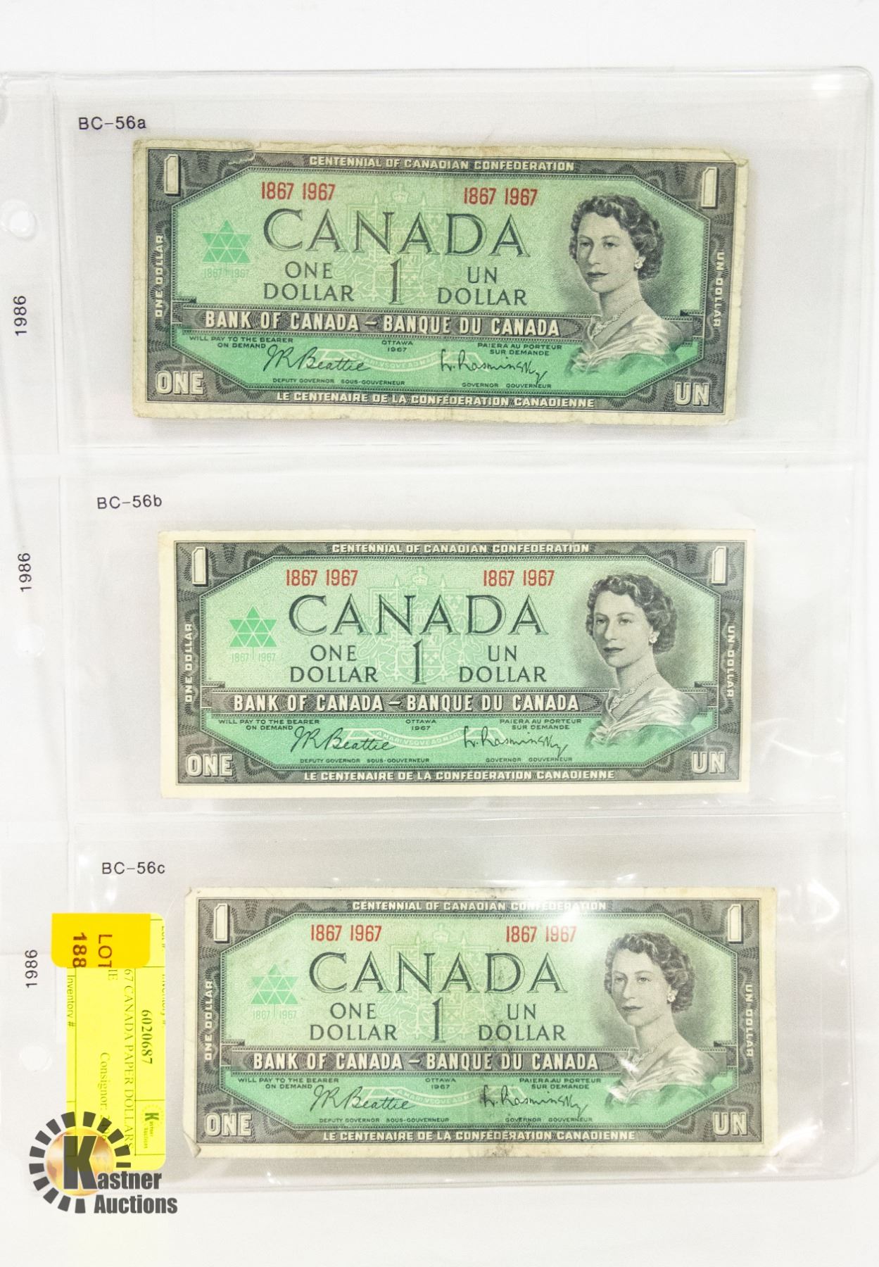RASMINSKY SET OF 3 CENTENNIAL CONFEDERATION ONE DOLLAR BILLS $1 **ALL ITEMS MUST BE REMOVED BY 5PM SATURDAY, OCTOBER 26th 2024. ALL REMAINING ITEMS WILL BE SUBJECT TO A $6.00 PER DAY STORAGE CHARGE. ANY ITEMS REMAINING AFTER MONDAY, NOVEMBER 11TH 2024 WILL BE CONSIDERED FORFEITED. NO REFUNDS WILL BE ISSUED FOR FORFEITED ITEMS. TO SCHEDULE A PICK UP APPOINTMENT CLICK HERE