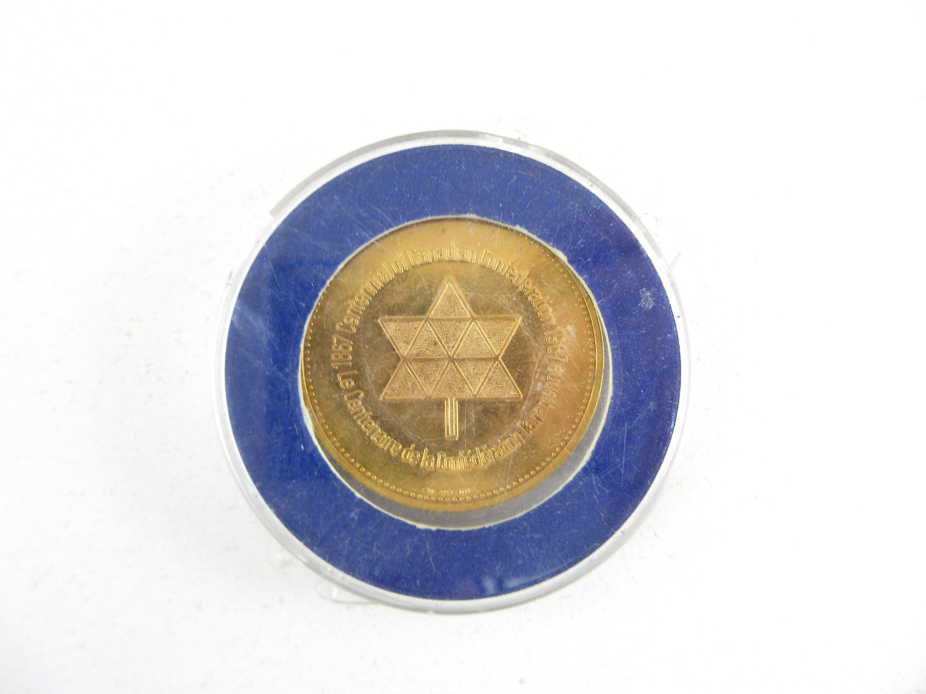 (1) 1867-1967 CANADIAN CONFEDERATION COIN, VARIOUS MARKINGS, APPROX. 1.5" DIA. SEE PHOTOS.