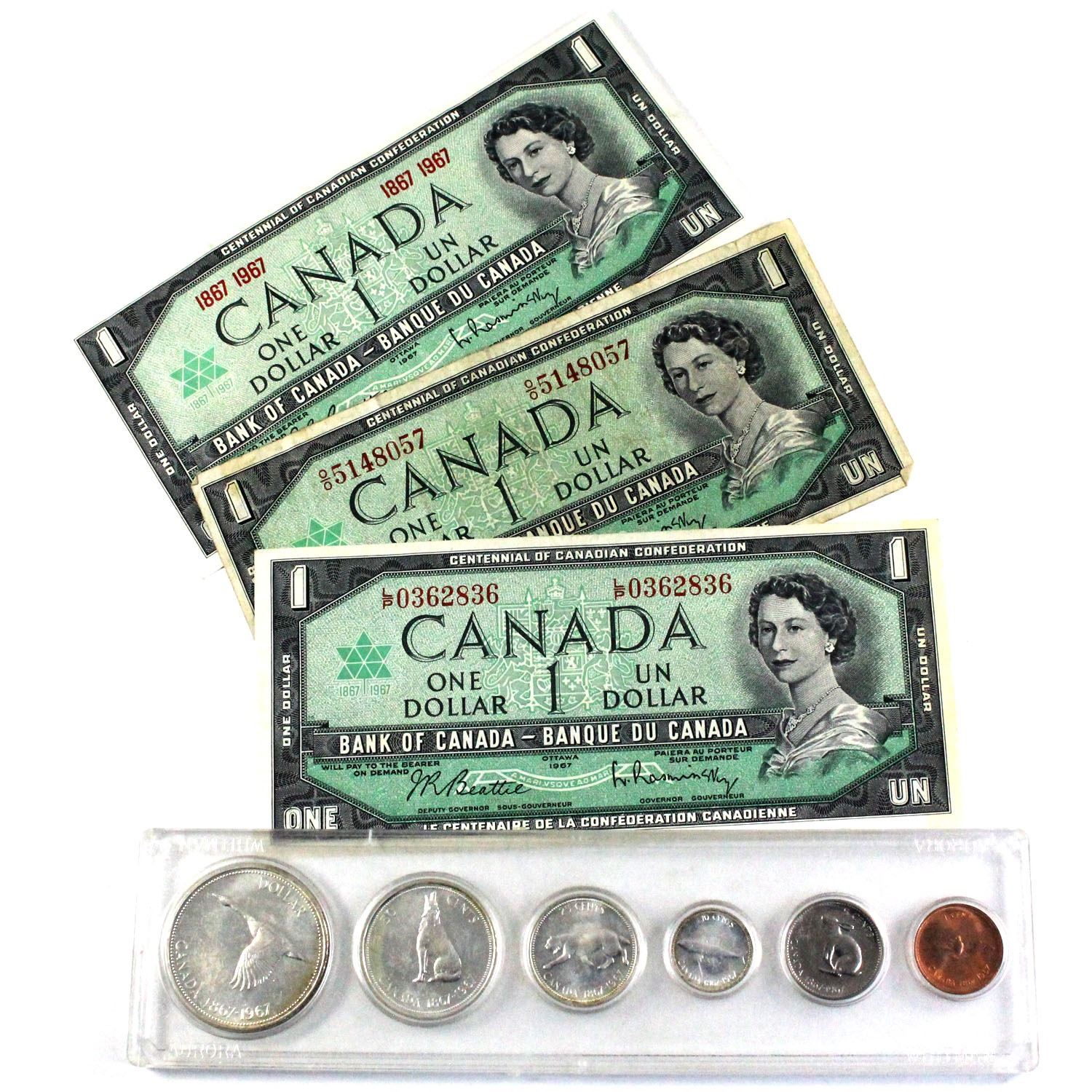 1867-1967 Canada Centennial Silver 6-coin Set with double date 1867-1967 $1 Bank Note by the Bank of Canada.