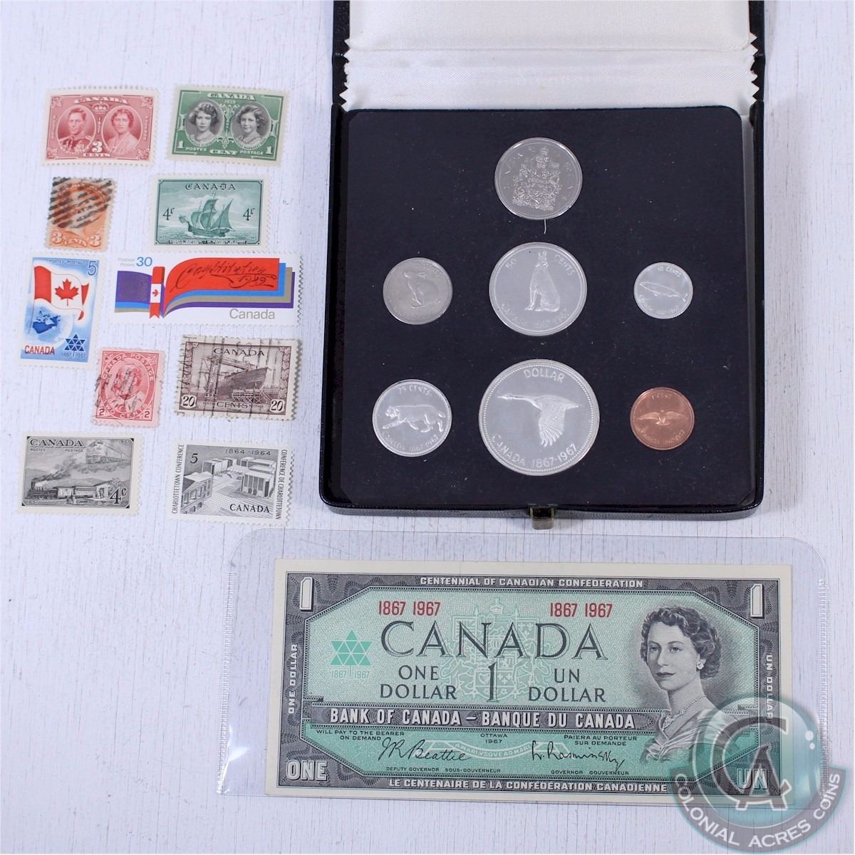 1867-1967 Canada Silver Proof Set with 2016 50-cent, 1967 $1.00 Banknote and 10 Unused Old Postage Stamps.