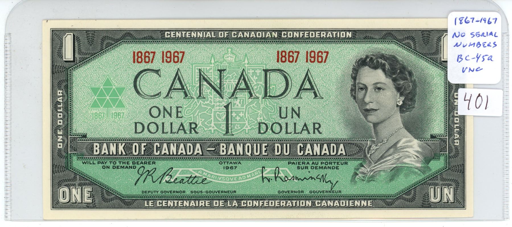 1867 – 1967 Centennial $1. No Serial Numbers. BC-45a. Uncirculated.