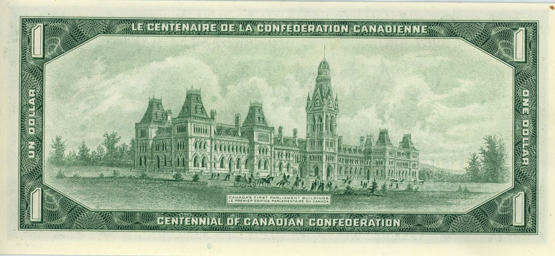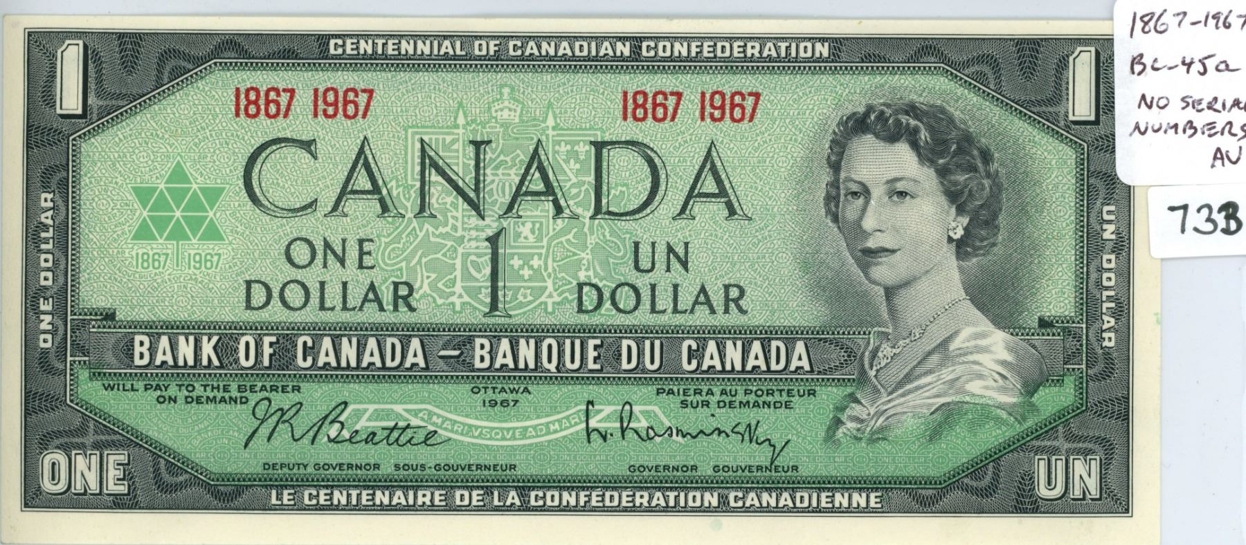 1867 – 1967 Centennial $1 with no Serial Numbers. Beattie-Rasminsky signatures. BC-45a. AU-50.