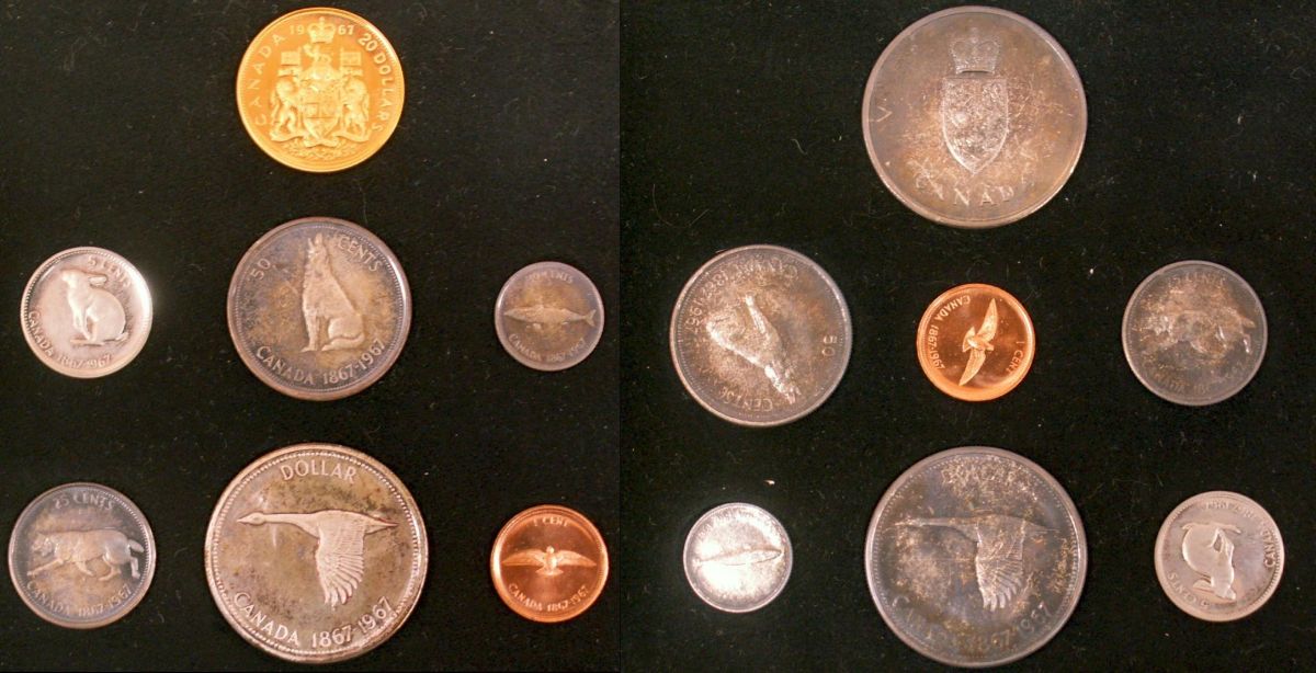 1867-1967 Commerative Coin Sets. Lot of two sets in their original black and red Cases. One set including the $20 Gold pc and the other with the Medallion. Both sets include 1¢ to $1 with the silver coins showing some nicely toned coins.