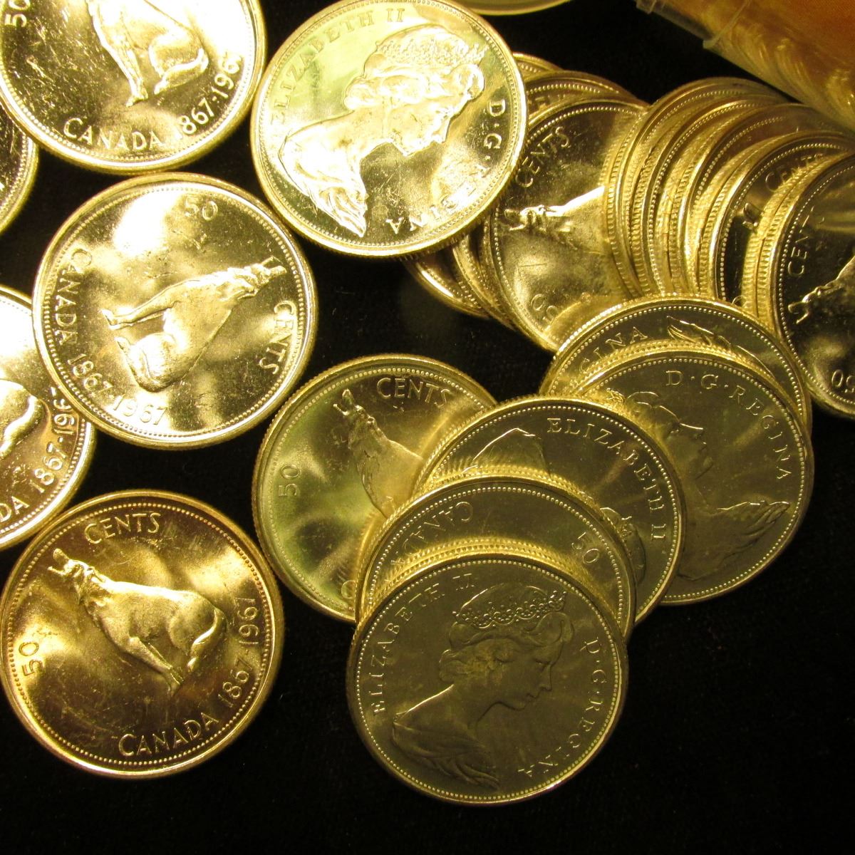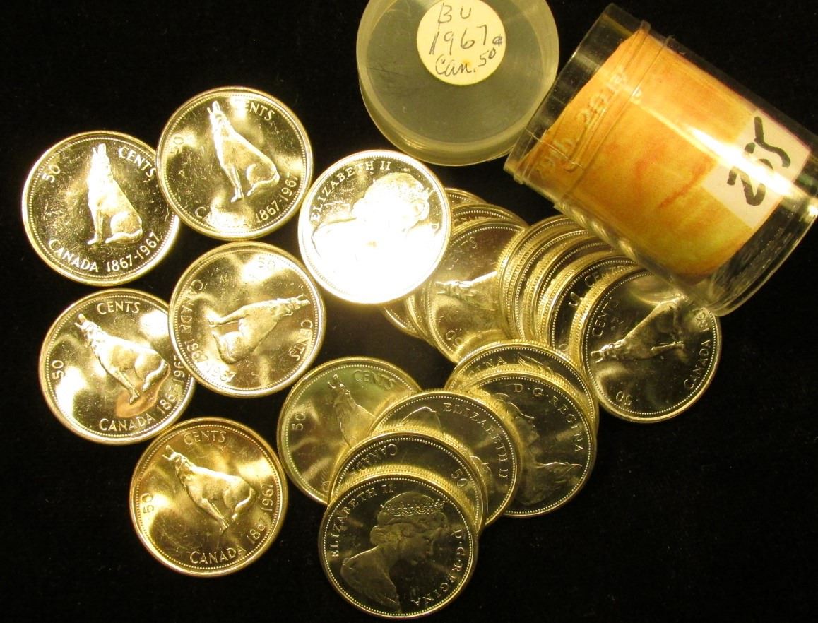 1867-1967 Original BU Roll of Canada "Confederation" Wolf Commemorative Half Dollars in a plastic tube. .800 fine Silver. (20 pcs.).