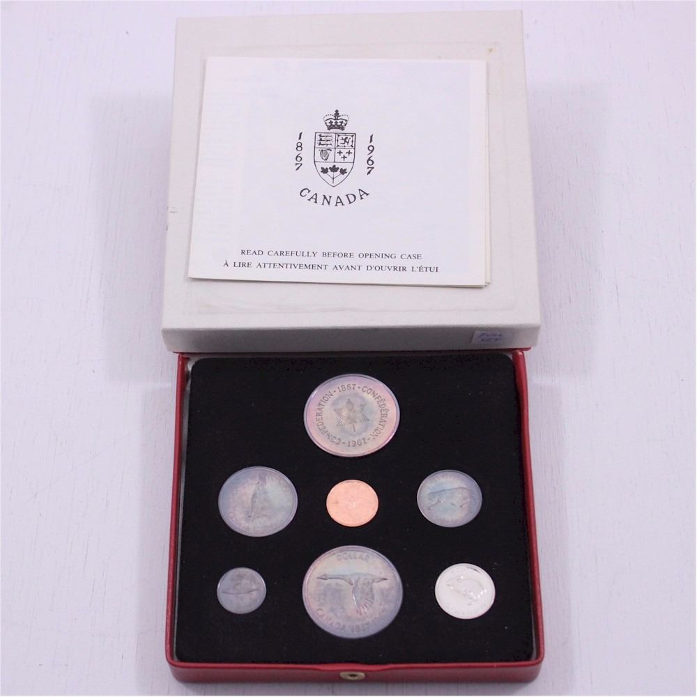 1867-1967 Specimen 7-coin set with special silver medallion in Red display Case issued by the Mint. Please note that the coins are toned in this set.