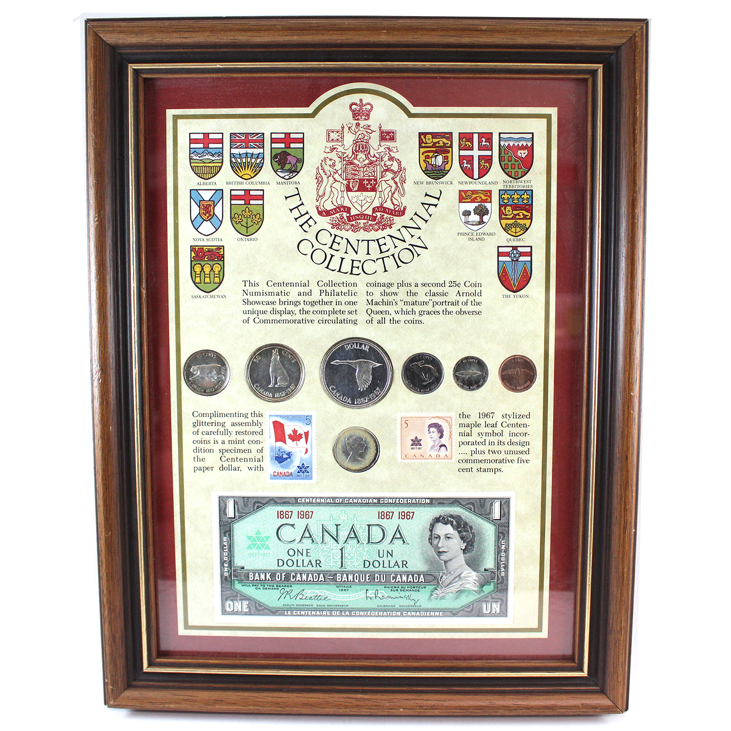 INCLUDES: 6 coin decimal set with extra 25-cent, 2 stamps & $1 banknote. Some scratches to plexiglass and frame