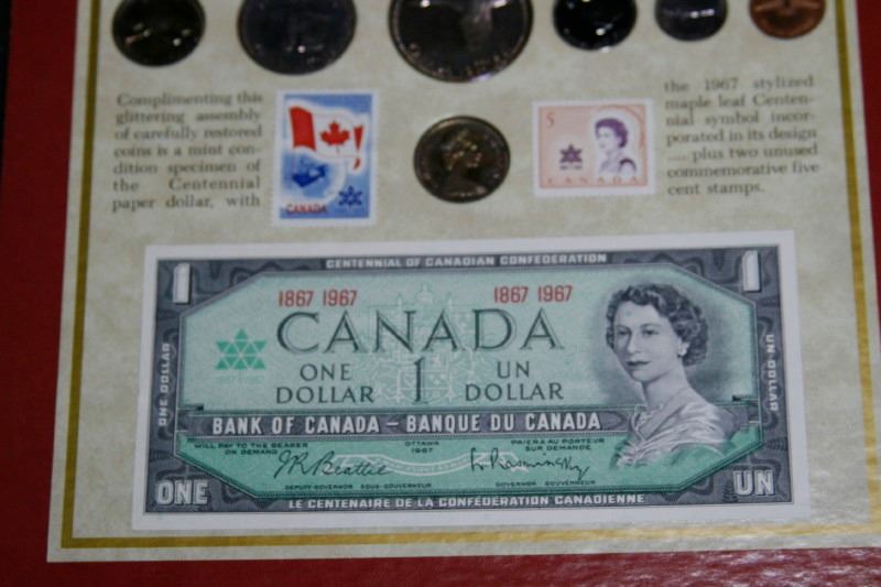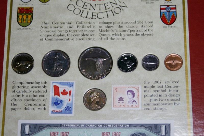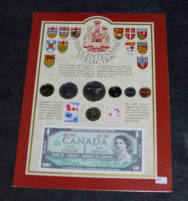 1867-1967 The Centennial Collection This Centennial Collection Numismatic and Philatelic Showcase brings together in one unique display , the complete set of circulating coinage plus a second 25 cent coin. Complementing this set is a mint Dollar bill and two unused commerative 5 cent stamps