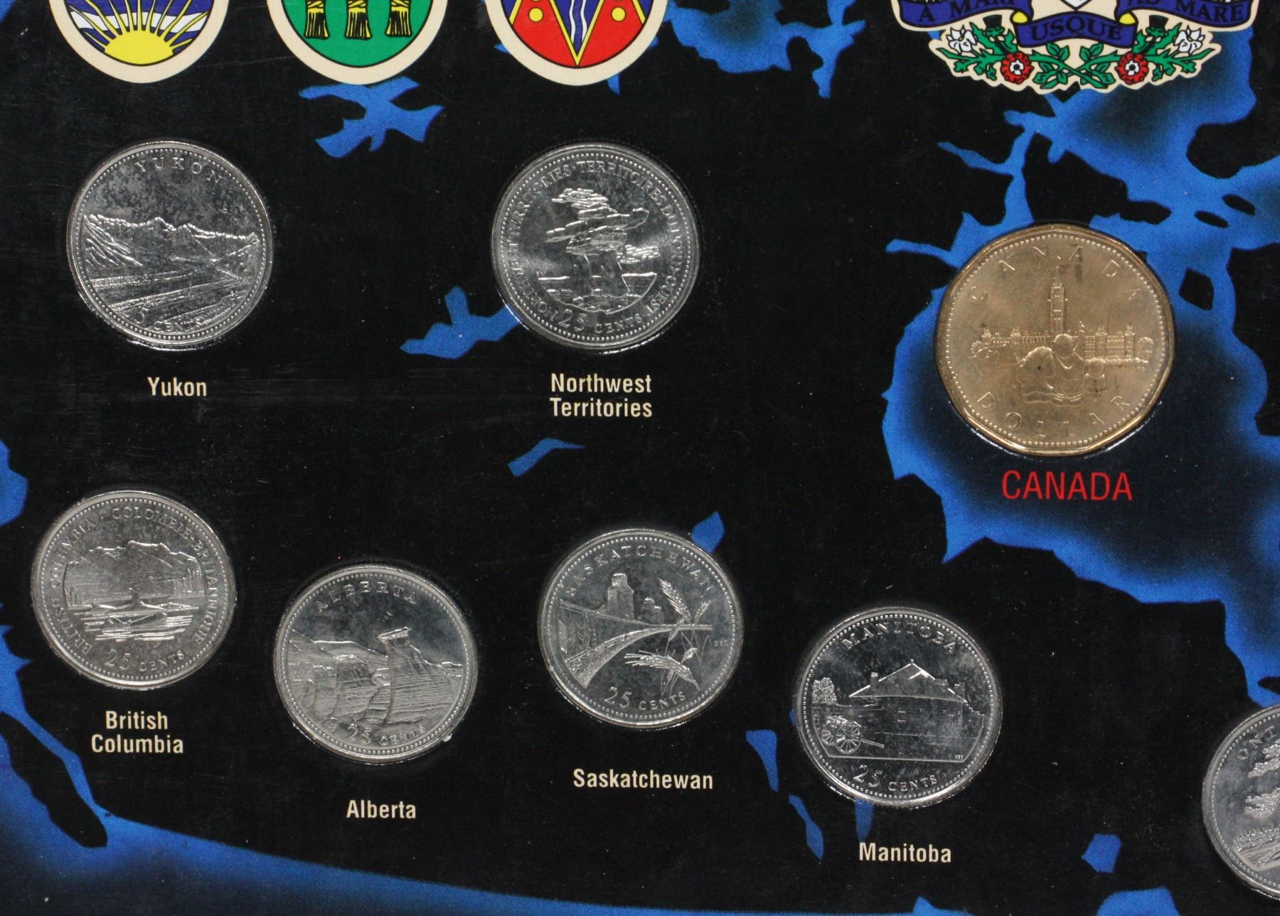 FEATURING ALL PROVINCES AND TERRITORIES WITH SPECIAL LOONIE IN DISPLAY. SPECIAL MAP OF CANADA SHOWING ALL THE PROVINCES AND TERRITORIES WITH THE COMMEMORATIVE QUARTER FOR EACH. GREAT FOR KIDS. LOOK AT SHINE ON THE QUARTERS FROM THE BACK AGAINSTS THE BLACK BACKGROUND.