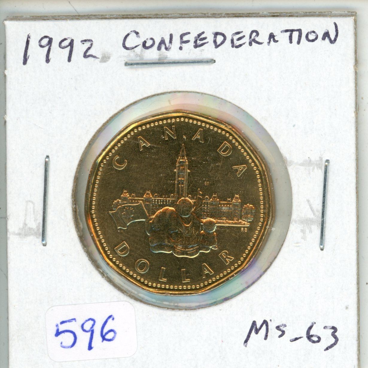 1867 – 1992 Confederation Loonie Dollar. Commemorates the 125th Anniversary of Canadian Confederation. MS-63.