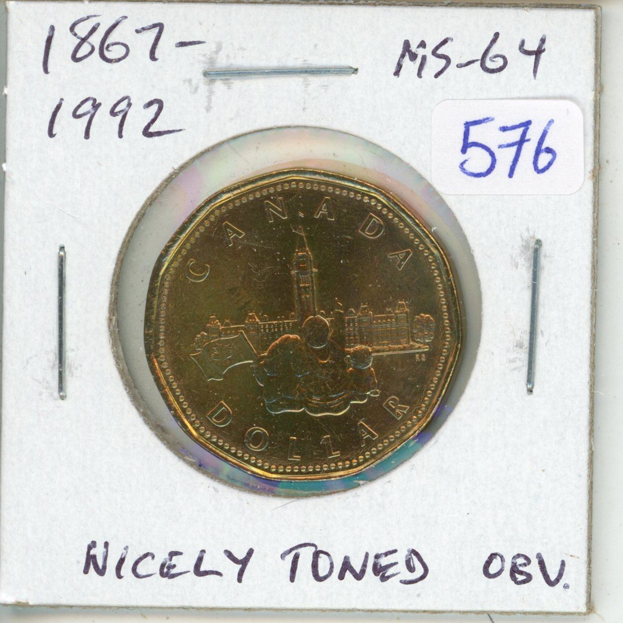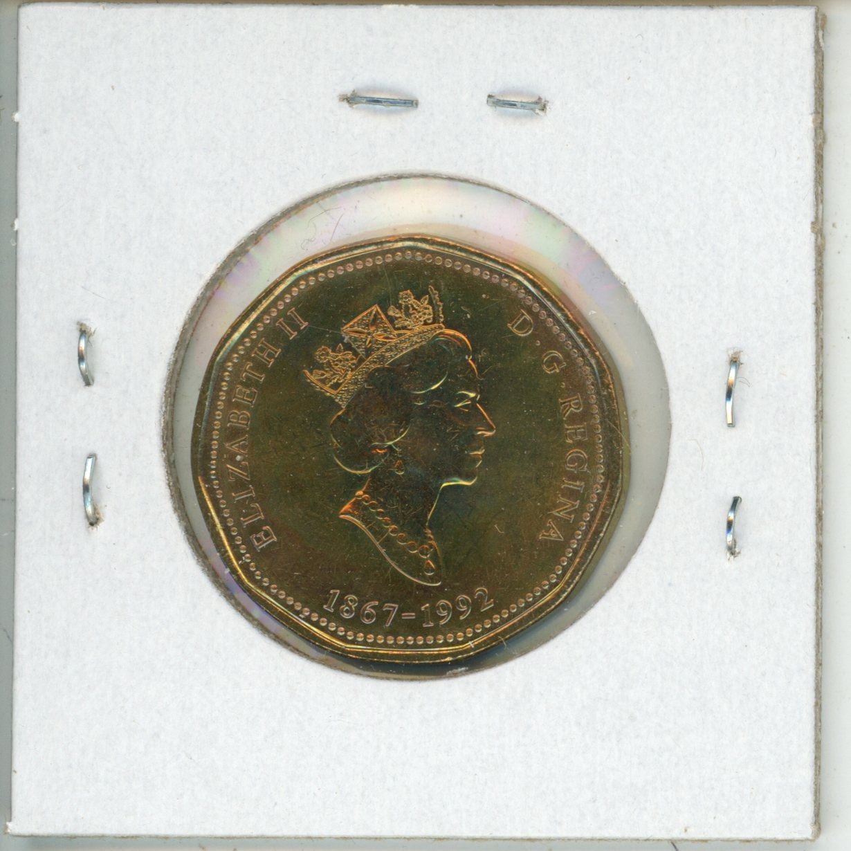 1867 – 1992 Confederation Loonie Dollar. MS-64. Nicely Toned Obverse.