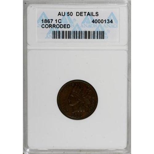 <B>1867 1C --Corroded--ANACS. AU50 Details.</B></I> NGC Census: (12/229). PCGS Population (16/136). Mintage: 9,821,000. Numismedia Wsl. Price for NGC/PCGS coin in AU50: $171. (#2088)<BR><BR><B>Coin Engraver:</B> James B. Longacre<BR><BR><b>Shipping:</b> Coins & Currency (<a target="_blank" href="http://www.heritageauctions.com/common/shipping.php">view shipping information</a>)