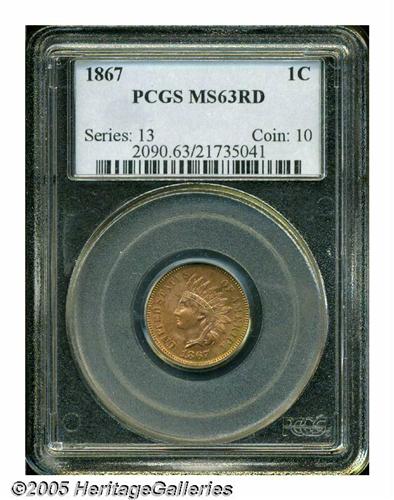 <B>1867<1C> MS63 Red PCGS.</B></I> Lustrous surfaces are enveloped in copper-gold patina, which reveals hints of yellow-green on the obverse rims. The design elements appear to be adequately struck, though the Indian's hair is soft in spots, as are some of the leaves on the reverse. Some toning spots are scattered about, as are a few flecks.