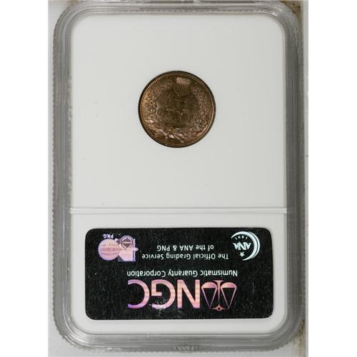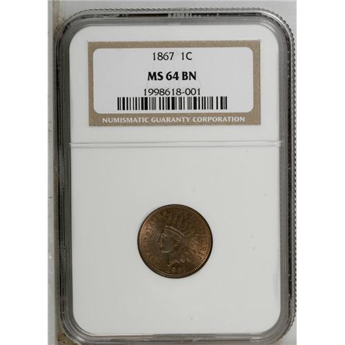 <B>1867<1C> MS64 Brown NGC.</B></I> Faded orange appears at the periphery, while violet-brown dominates the centers. A nicely struck near-Gem with great eye appeal. Census: 63 in 64 Brown, 29 finer (9/06).