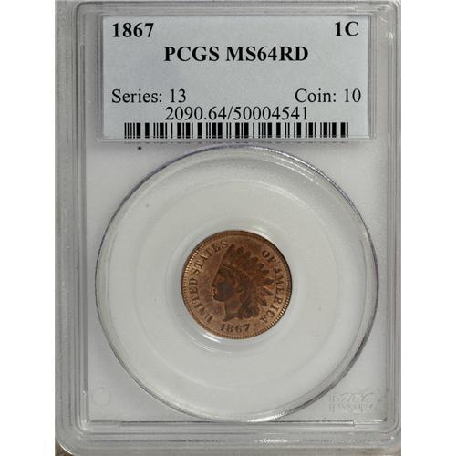 <B>1867 1C MS64 Red PCGS.</B></I> A satiny near-Gem with straw-gold fields and borders, while the centers feature deep ruby shades. Well struck save for the upper right corner of the shield. Population: 63 in 64 Red, 18 finer (2/07).<BR><BR><b>Shipping:</b> Coins & Currency (<a target="_blank" href="http://www.heritageauctions.com/common/shipping.php">view shipping information</a>)