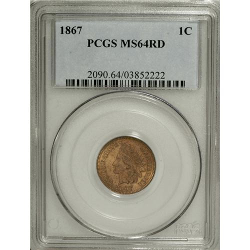 <B>1867 1C MS64 Red PCGS.</B></I> The 1866 and 1867 issues are early semikey dates in the Indian cent series. This piece offers orange-gold surfaces that show numerous flecks on each side, along with a more noticeable dark area through the N of CENT.<BR><BR><b>Shipping:</b> Coins & Currency (<a target="_blank" href="http://www.heritageauctions.com/common/shipping.php">view shipping information</a>)