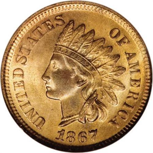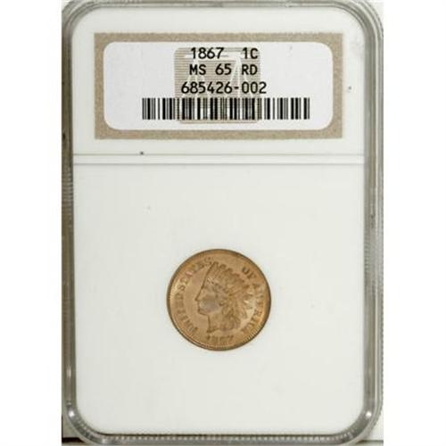 <B>1867 1C MS65 Red NGC.</B></I> This Gem example is conditionally scarce and possesses rare eye appeal, by virtue of rich luster and the depth of red-golden-orange coloration that adorns both sides. The design details are fully brought up on both sides, with none of the often-seen incompleteness on the headdress feather tips or the lower reverse wreath. Other than two or three tick marks on Liberty's cheekbone, the carefully preserved surfaces are blemish-free. Census: 11 in 65 Red, 0 finer (6/07). <I>From The Santa Fe Collection.</B></I><BR><BR><B>Coin Engraver:</B> James B. Longacre<BR><BR><b>Shipping:</b> Coins & Currency (<a target="_blank" href="http://www.heritageauctions.com/common/shipping.php">view shipping information</a>\)