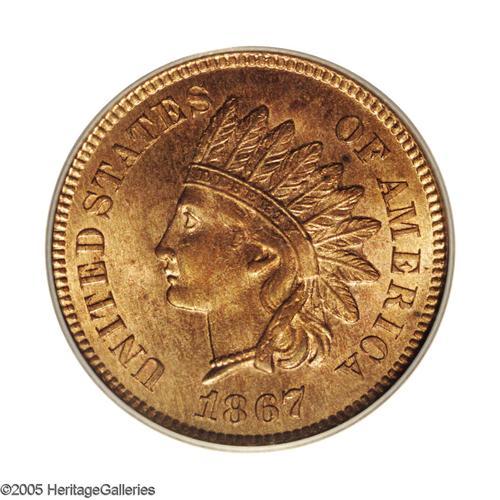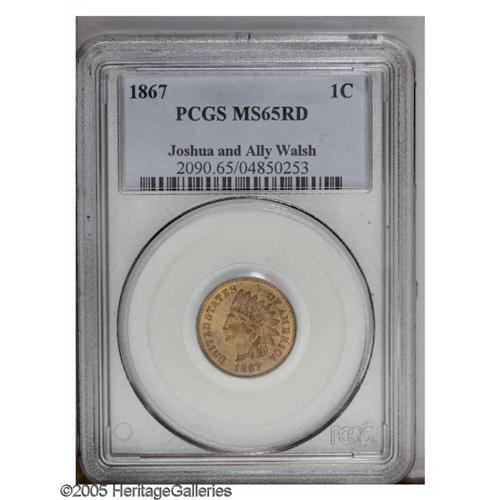<B>1867<1C> MS65 Red PCGS.</B></I> The 1867 is another early bronze Indian Cent with a low mintage. In this case only 9.82 million pieces were produced and full red Gems are very rare. In fact, only 17 other pieces have been so graded with one finer (11/05). This lovely piece has lovely, original mint luster over both sides and the devices appear to all be fully struck. Housed in an earlier PCGS holder with a green label.<BR><I>From The Joshua and Ally Walsh Collection of United States Cents.</B></I>
