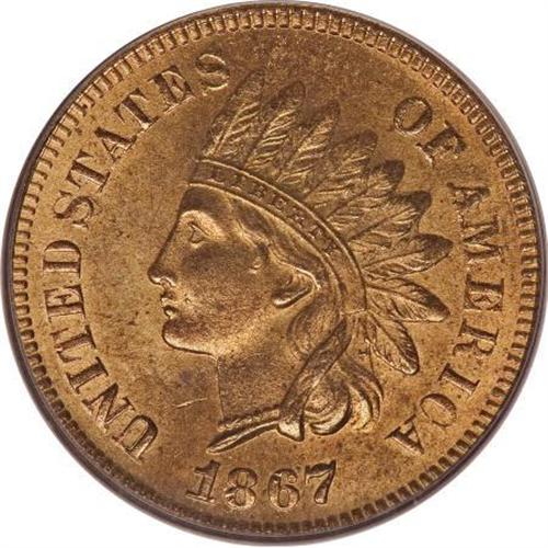 <B>1867 1C MS65 Red PCGS.</B></I> David Bowers, in his treatise <I>A Buyer's and Enthusiast's Guide to Flying Eagle and Indian Cents</B></I>, says of the availability of the 1867 in Mint State: "Quite Elusive. Most are brown or red and brown. Original bright red specimens were rare years ago and are even more elusive today; most 'Brilliant Uncirculated' pieces on the market have been dipped."<BR> The original lustrous surfaces of this MS65 Red example yield bright orange-gold color, and a scattering of light toning spots. An attentive strike brings out good detail in most of the design features, except for softness in the tips of the headdress feathers and the horizontal lines of the shield. The four diamonds are bold. A few minor obverse marks do not detract.<I><BR>From The Santa Fe Collection.</B></I><BR><BR><B>Coin Engraver:</B> James B. Longacre<BR><BR><b>Shipping:</b> Coins & Currency (<a target="_blank" href="http://www.heritageauctions.com/common/shipping.php">view shipping information</a>\)
