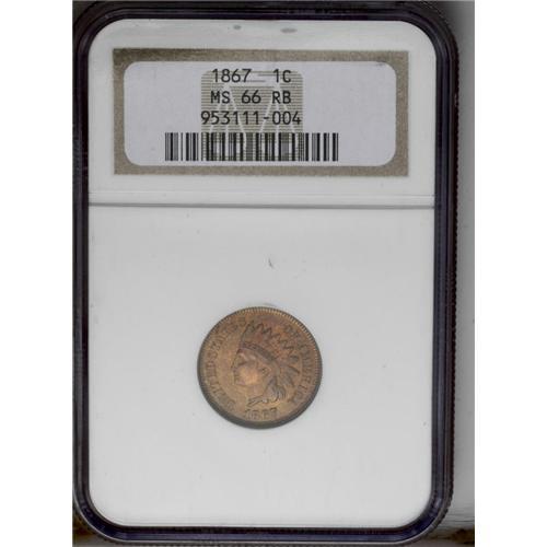 <B>1867<1C> MS66 Red and Brown NGC.</B></I> Fully struck with satiny, matte-like surfaces, lovely rich reddish-brown color on the obverse, equally attractive apricot-brown patina on the reverse, and no bothersome abrasions or contact marks. A rather spectacular premium Gem.
