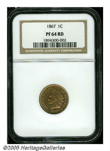 <B>1867<1C> PR64 Red NGC.</B></I> A needle sharp specimen with a reddish-golden appearance overall. Only a small percentage of proofs from this year have survived in a Choice, relatively unmellowed state of preservation. Population: 11 in 64, 15 finer (4/05).