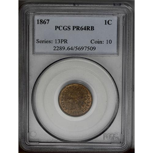 <B>1867<1C> PR64 Red and Brown PCGS.</B></I> A well struck near-Gem that has unmarked surfaces and luminous peripheral gold color on the reverse. The centers have variegated golden-brown and lavender colors. Clearly original and attractive.